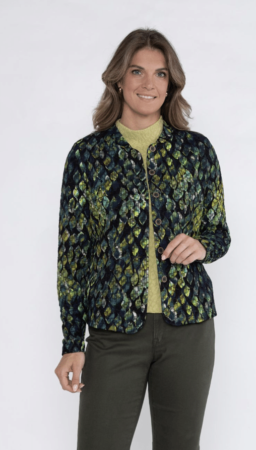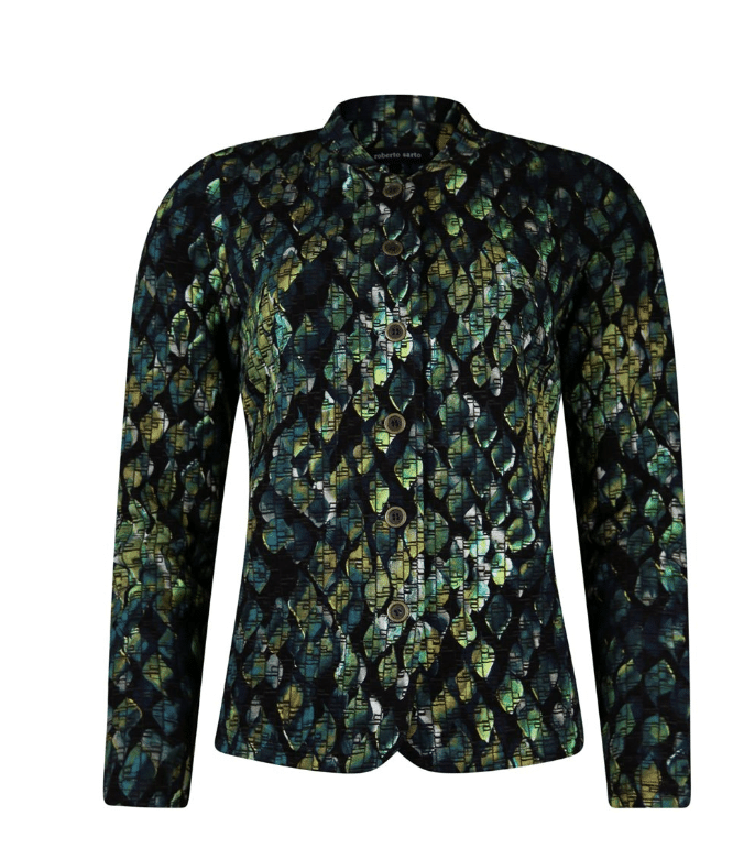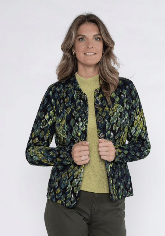 De musthave voor dit najaar, prachtig ongevoerd jasje/vest met grote knopen en allover print, mooie subtiele print exclusief van Roberto Sarto. Kleurstelling met verschillende tinten groen en marine blauw (multicolor). chanel model en lange mouw lengte.