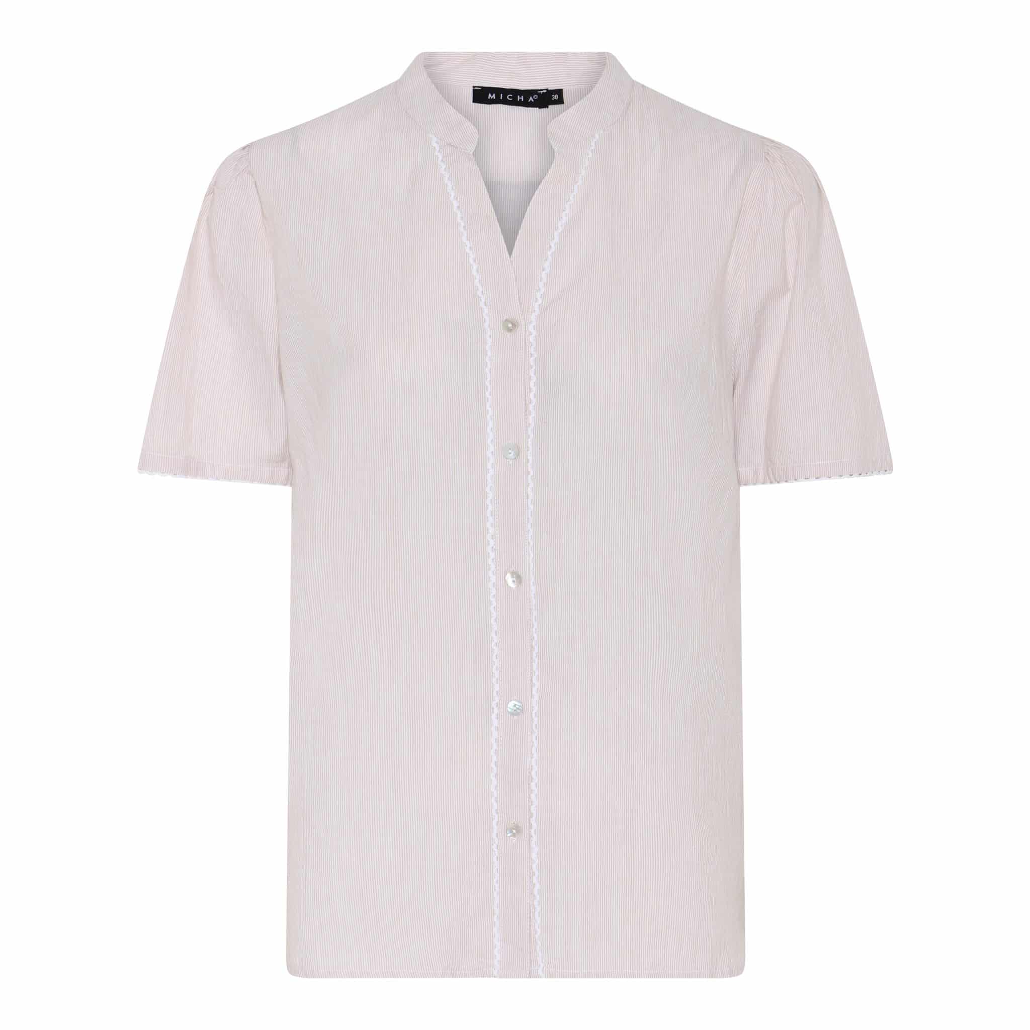 zuiver katoenen blouse met opstaande kraag en heel fijn streepje in de katoenen stof van het merk Micha. Mooie luchtige katoen kwaliteit met knoopsluiting tot de onderzijde en lange mouw lengte in de kleur zand / offwhite.