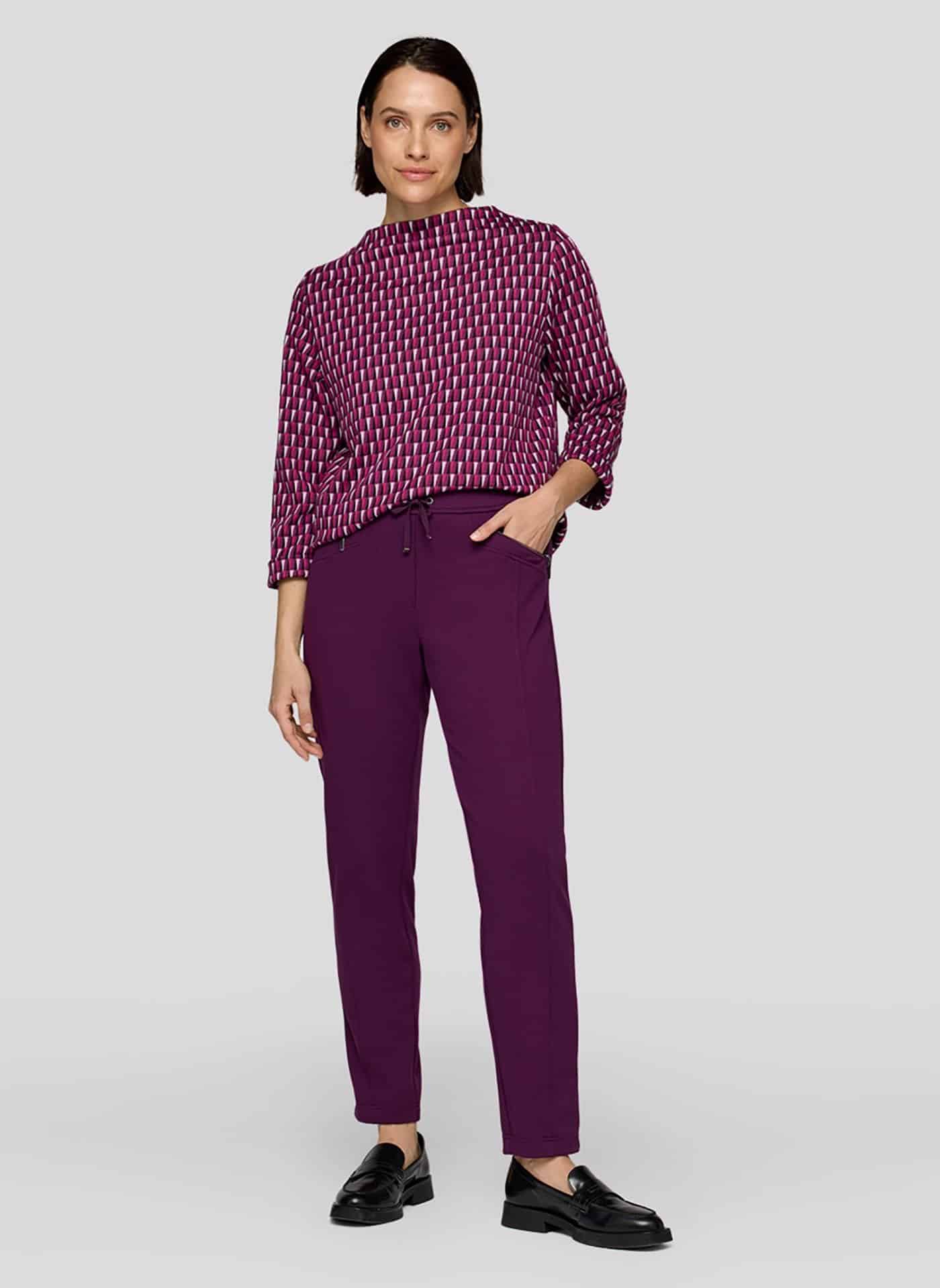 Mooie tricot (zware viscose) pantalon van het merk Rabe. Elastiek rondom met een namaakgulp en sportief look middels het zakje en koortje aan de voorzijde en een soepele elastieke band rondom. Dit model zit bijna alle dames goed!
