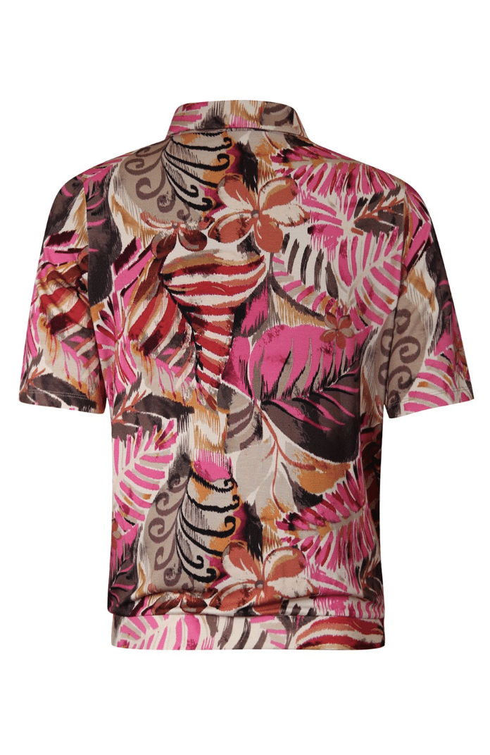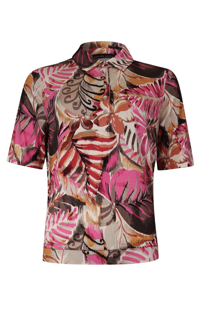 Poloshirt met een de nieuwste allover print in de een prachtige kleuren combinatie roze, zand en taupe van Roberto Sarto. Dit poloshirt heeft een elastiek aan de onderzijde (blouson model), hoogeslote polo halslijn en met een kort mouwtje tot op de elleboog. Pasvorm is royaal.
