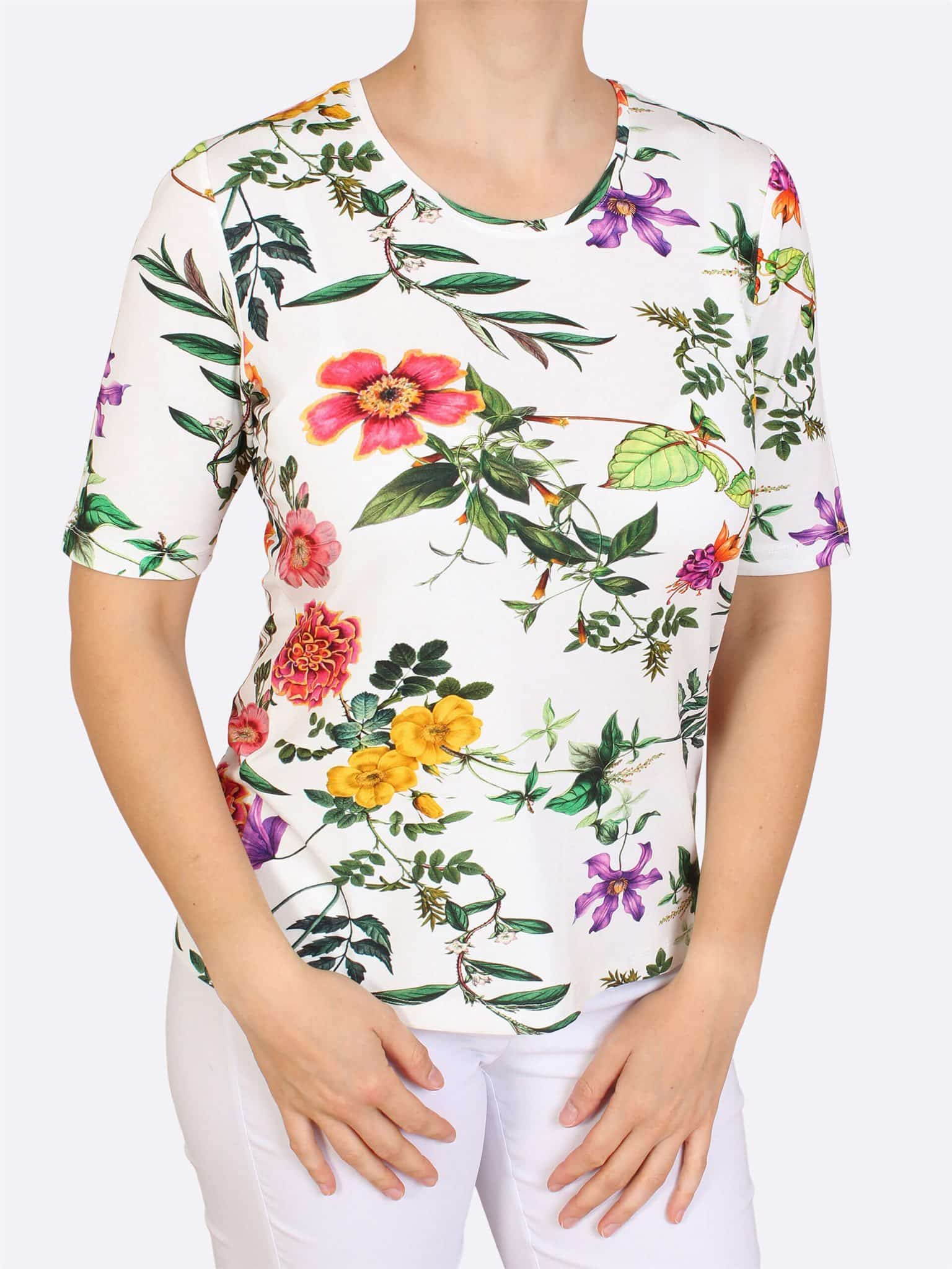 Mooi uitgewerkt shirt met een korte mouw lengte en allover print van het merk Lea H. Prachtige halslijn en fijne kleurencombinatie met geel en rood en groen.