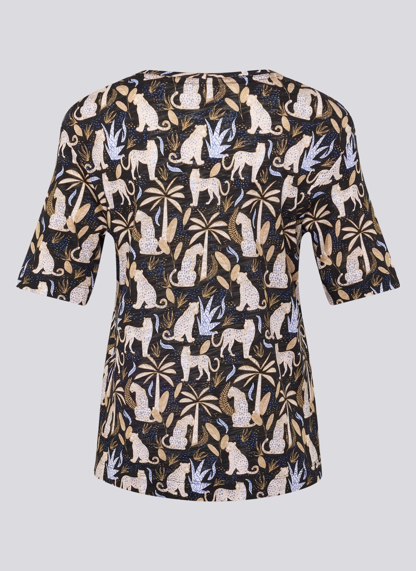 Bewerkt shirt met mooie allover print met exotische dieren print in een mooie donkere kleurstelling. Perfect te combineren met vele leuke vesten en andere items uit de nieuwste serie van Rabe dit voorjaar. Mooie sportieve halslijn en fijne luxe details van het merk Rabe. Dit shirt heeft een korte mouw lengte, mooie zachte kwaliteit en kleurstelling lichtblauw, bruin en offwhite.
