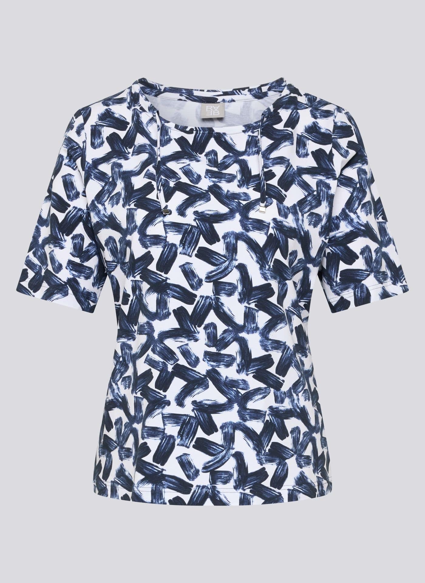 Bewerkt shirt met mooie allover print. Perfect te combineren met het donker blauwe en witte vesten en andere items uit de nieuwste serie van Rabe en Micha deze zomer. Mooie halslijn en fijne details van het merk Rabe. Dit shirt heeft een korte mouw lengte tot op de elleboog, mooie zachte kwaliteit en kleurstelling navy en wit