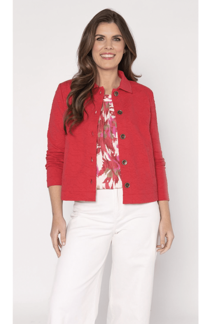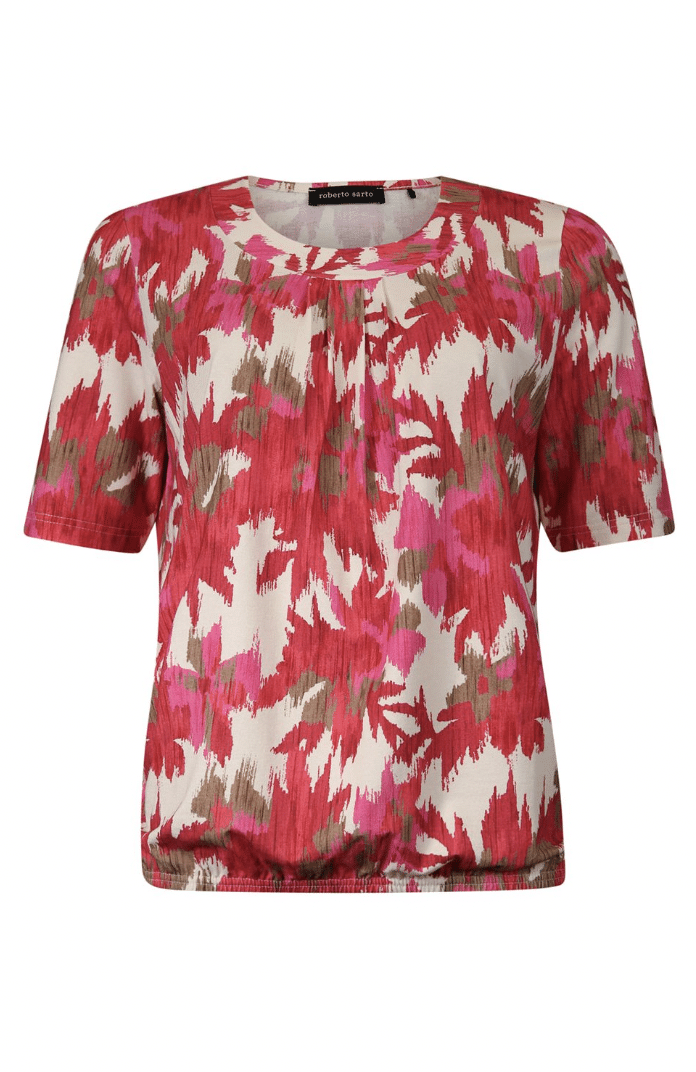 Shirt met een de nieuwste allover print in de een prachtige kleuren combinatie rood en roze van Roberto Sarto. Dit shirt heeft een elastiek aan de onderzijde (blouson model), gesmokte halslijn en met een kort mouwtje tot op de elleboog. Pasvorm is royaal.