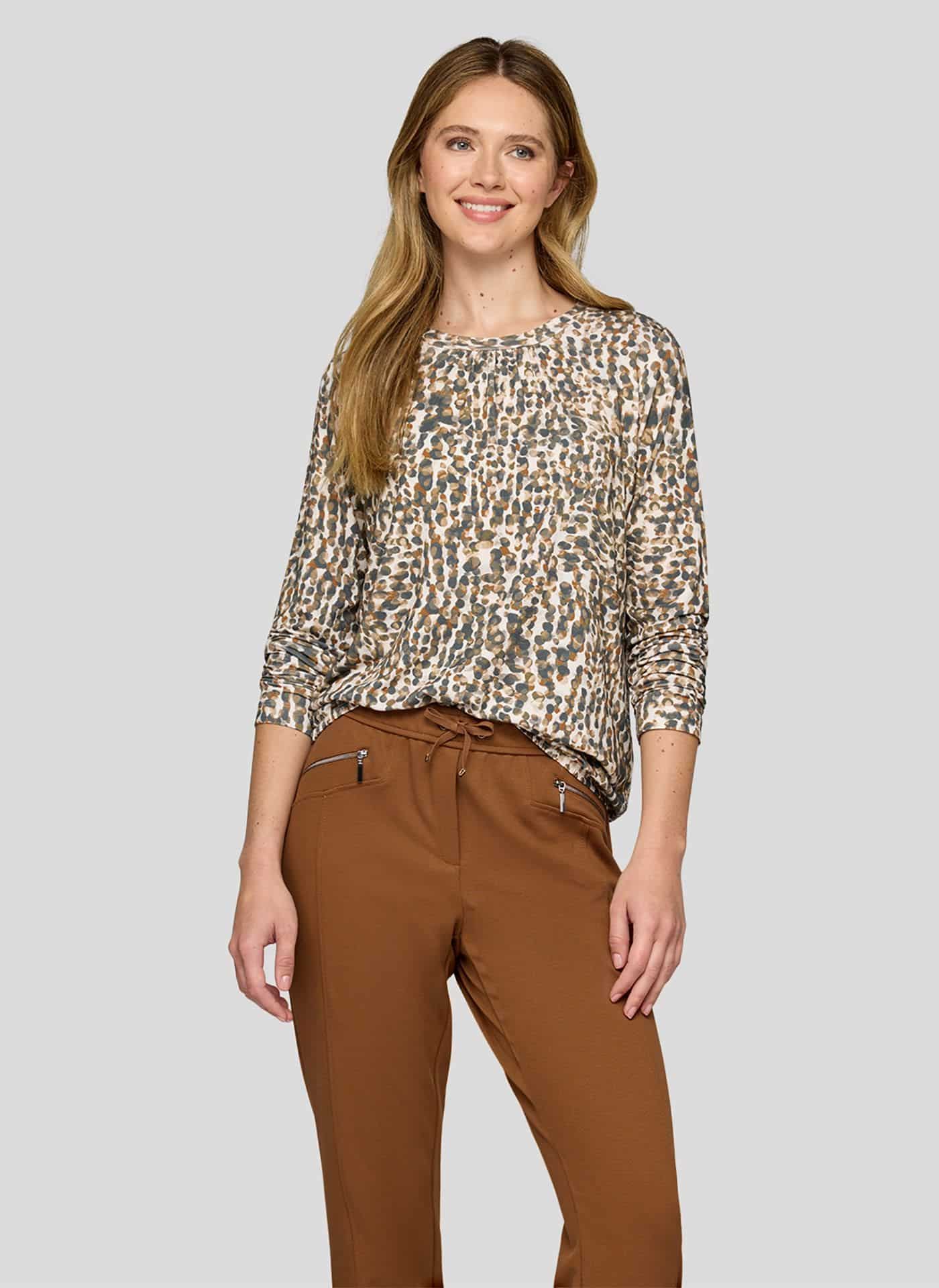 Uni shirt in een col model met elastiek aan de onderzijde en gesmokte halslijn. Perfecte basis en goed te combineren met violet jasjes en vesten uit dezelfde serie van Rabe deze winter. Mooie halslijn en fijne details van het merk Rabe. Dit shirt heeft een lange mouw lengte, mooie zachte maar dikkere viscose kwaliteit en