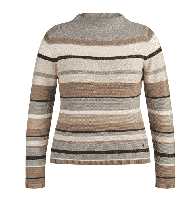Fijne trui met een smalle banen print en sportieve col kraag in de kleuren combinatie met oa grijs en camel aan voor- en achterkant. Deze trui heeft een hooggesloten kraag en is van het merk Rabe.