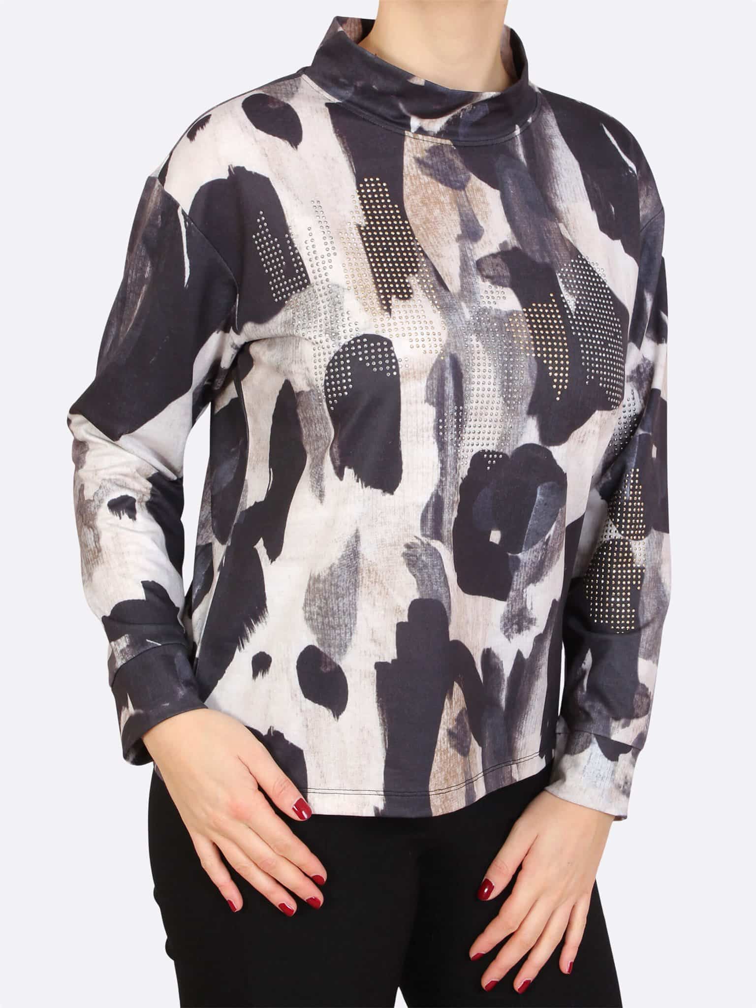 Allover print sweater in een warme kwaliteit met Lange mouw lengte en sportieve col kraag van het merk Lea H. Opvallende zwarte print in een mooie kleurencombinatie.