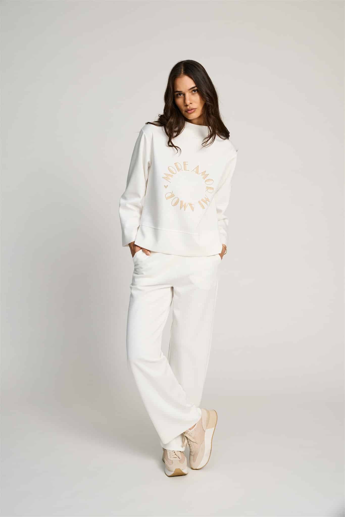 Nieuw sportlook klassiek, Jumper nu in de uni sweater kwaliteit van het merk Micha. Deze fijne trui heeft een lange mouw lengte, ronde hals lijn en is hooggesloten met leuke speelse details zoals de print aan de voorzijde. En als pak super leuk te combineren met de bijpassende wijde broek van Micha.