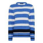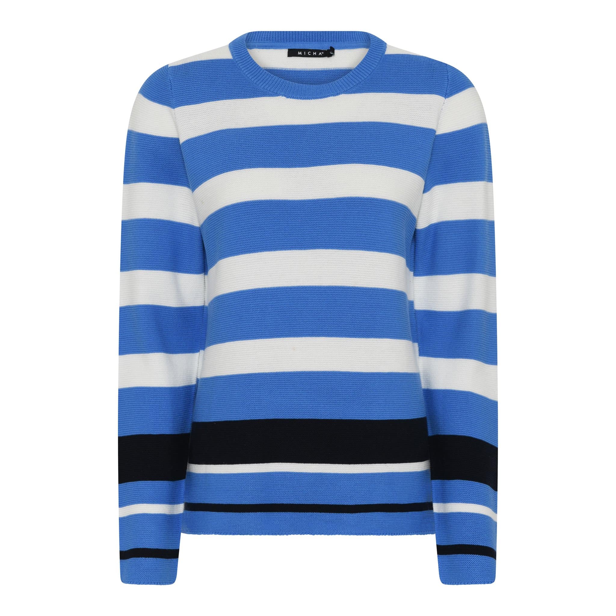 Gestreepte jumper (dunne trui) van het merk Micha. Deze fijne trui heeft een lange mouw lengte, ronde hals lijn en is hooggesloten met leuke speelse details. De subtiele kleurencombinatie is perfect voor dit voorjaar.