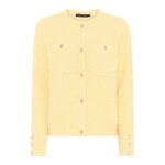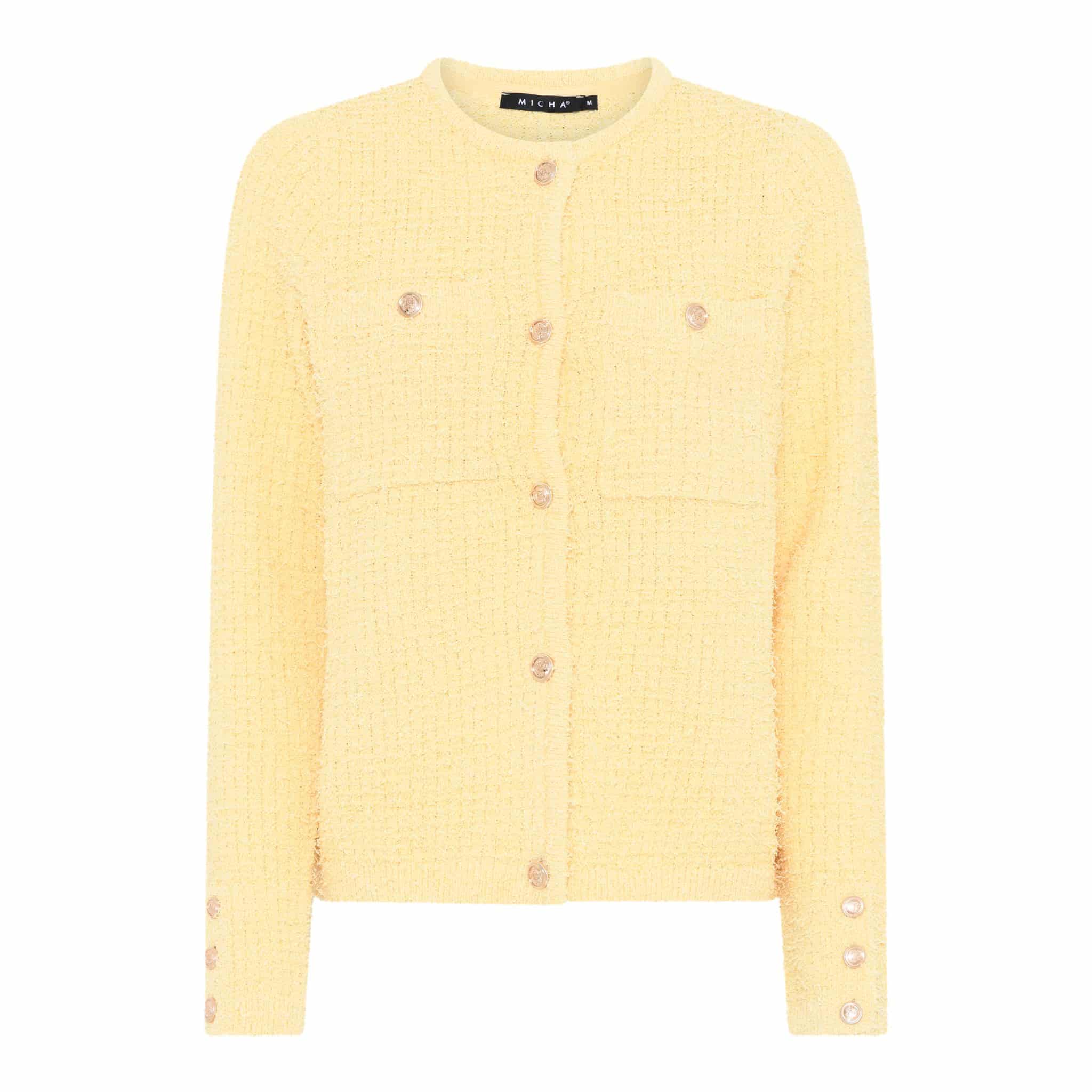 Fijn soepel vest-jasje in een zomerse bouclay stof, met chanel kraag van merk Micha. Dit vest in een mooie rekbare kwaliteit heeft knopen en lange mouw lengte en super mooi uitgewerkt met de zakken aan de voorzijde.