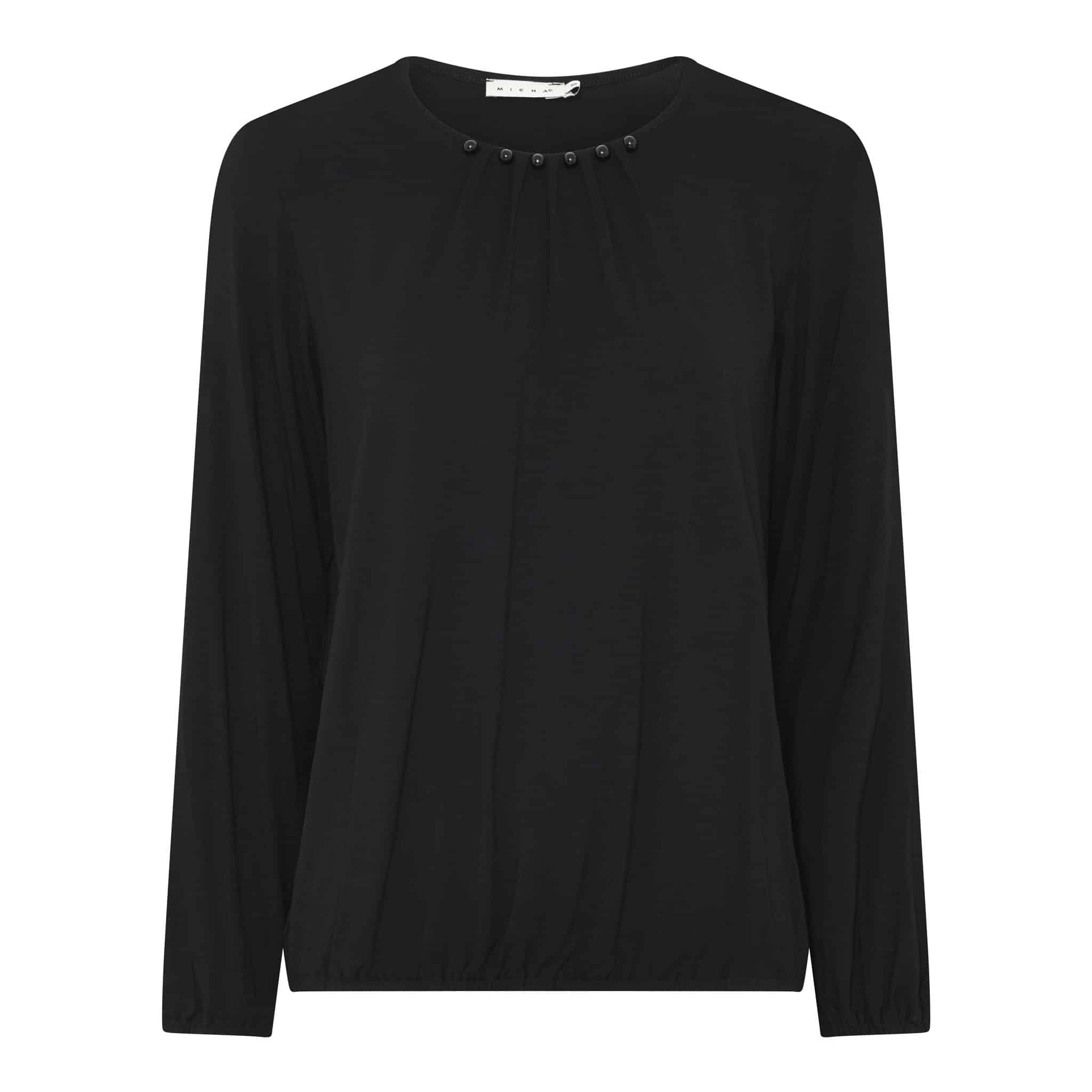 Uni basis shirt (blouson model, elastiek aan de onderzijde) met mooie halslijn in een mooie zachte viscose kwaliteit van het merk Micha. lange mouw lengte en mooie halslijn. perfect voor onder vesten of jasjes.