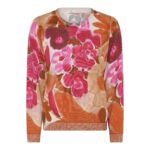 Bewerkte jumper (dunne trui) met prachtige print allover van het merk Micha. Deze fijne trui heeft een lange mouw lengte, ronde hals lijn en is hooggesloten. De kleurencombinatie is prachtig met roze en terra tinten op een camel basis. Perfect te combineren dit najaar.